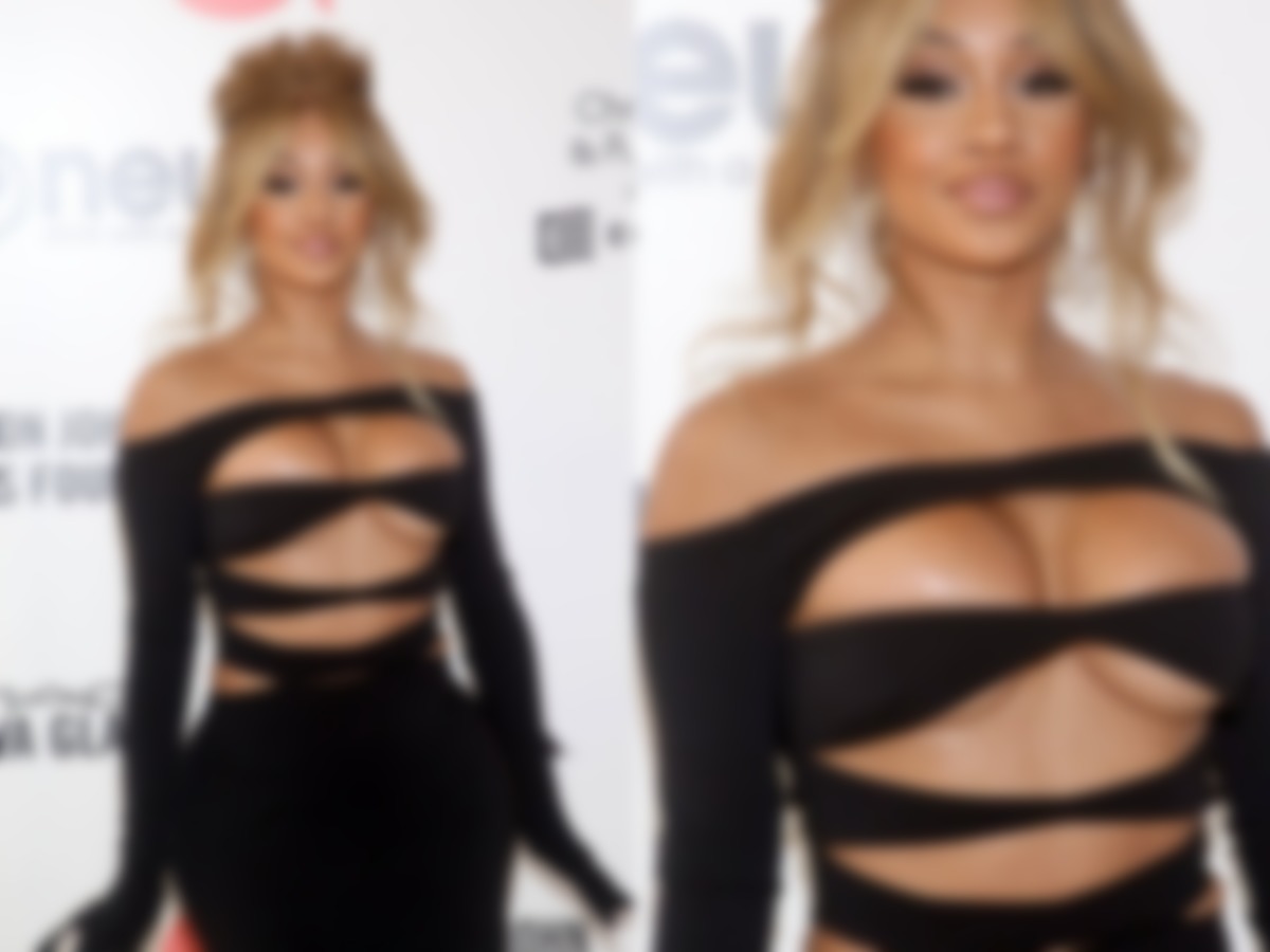 Похожий наряд был на известной американской рэп-исполнительнице. Она предпочла надеть модель с перчатками, полностью закрывающими руки и ассоциирующимися с Covid-2019. В паре к ним полагалось платье с практически полностью открытым бюстом.