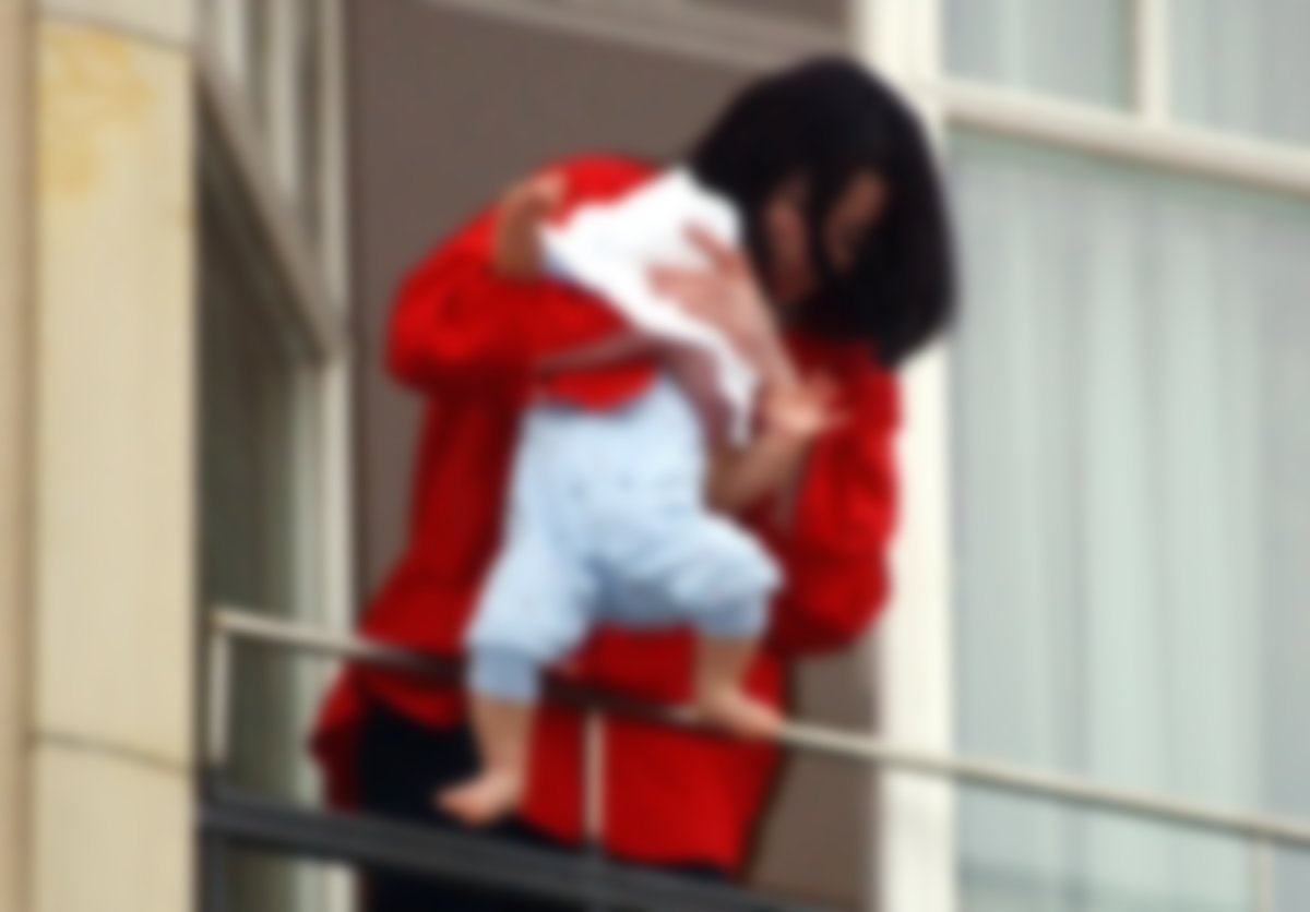 В тот день под окнами отеля в Берлине, где проживал Майкл с семьей, собрались фанаты артиста. Он вышел с ними поздороваться с 9-месячным сыном на руках. Неожиданно, Джексон закрыл голову ребенка полотенцем и перевесил его через перила. Толпа ахнула, а Майкл подтянул к себе малыша и скрылся в номере.