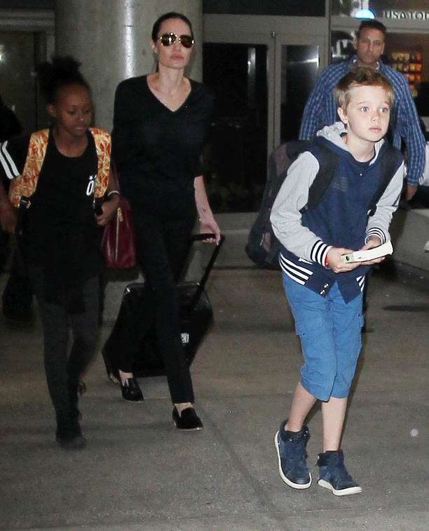 Папарацци застали Джоли, когда она выходила из аэропорта со старшими детьми. С ней были Захара (Zahara), Шайло (Shiloh), Пакс-Тьен (Pax Thien) и Мэддокс (Maddox).