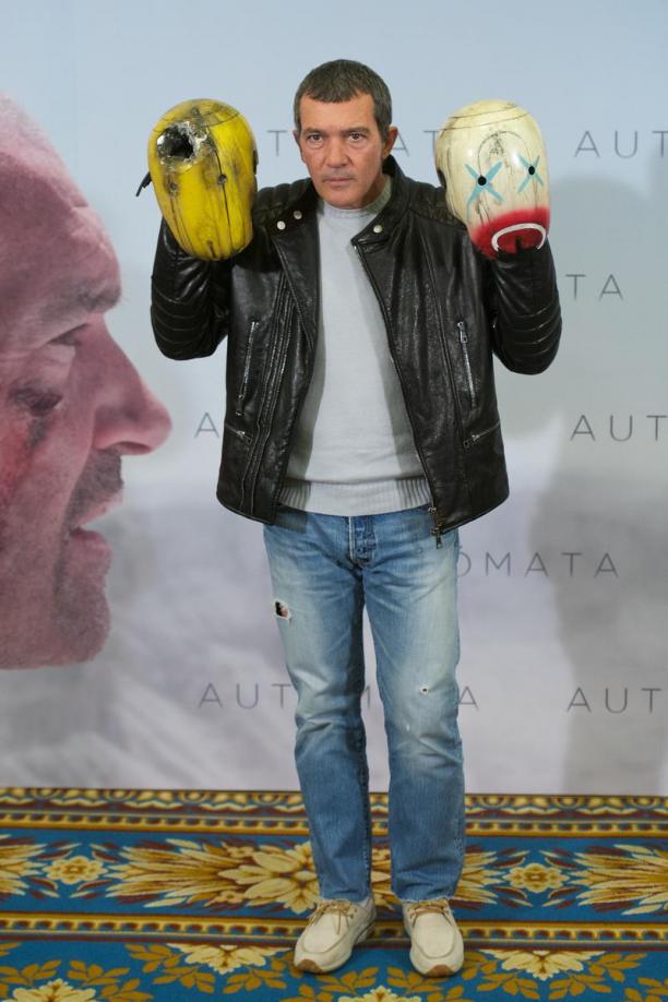 В Испании прошел фотоколл, посвященный фильму «Страховщик». 54-летний Антонио сыграл в нем главную роль. Сюжет такой: 2044-й год. После природной катастрофы население Земли уменьшилось до 21 миллиона человек. Большую часть суши теперь занимает радиоактивная пустыня, а выжившие скрываются в городах за высокими стенами, им помогают выжить роботы… Маски роботов Антонио держит в руках на снимке.
