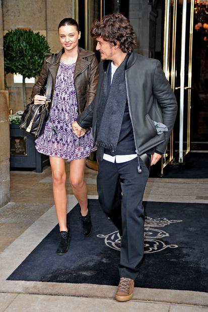 Британский актёр Орландо Блум (Orlando Bloom) и его жена Миранда Керр (Miranda Kerr) выходят из дворца George V Palace после показа коллекции Balenciaga на Неделе моды в Париже, Франция, 30 сентября 2010.