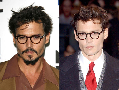 Знаменитости с бородой и без бороды. Актер Джонни Депп (Johnny Depp) на левом фото - на премьере фильма "THE LIBERTINE" в Лос-Анджелесе, 11 ноября 2005, на правом фото - в Лондоне, 2004.