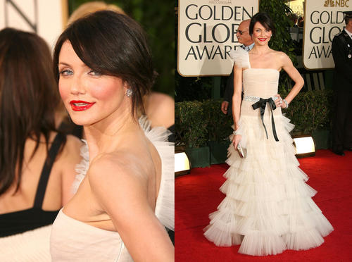 очень люблю Камерон! Очень светлый образ. Блондинкой она мне казалась моложе, но с голубыми глазами этот цвет волос суперский контраст. Скорее всего, я не понимаю в моде от кутюр, но мне непонятен этот траурный бантик на таком лирическом платье. Да еще и "такой большой"