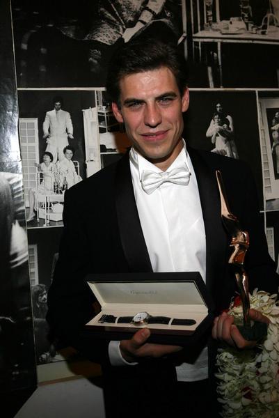 Церемония вручения театральной премии "Чайка", Театр им. Моссовета, Москва, 18 декабря 2006. На фото - Дмитрий Дюжев. Дмитрий Дюжев после выхода на экраны знаменитой "Бригады" долгое время был мил и корректен со всеми представителями пишущей братии. Ровно до тех пор, пока одно из массовых изданий не выдало "сенсационную правду" о семье Дмитрия, выставив на всеобщее обозрение слишком личные для актера вещи и переживания. С тех пор Дюжев принципиально общается только с телевизионщиками, но даже в этом случае ограничивается короткими репликами. Полностью солидарен с Дмитрием и его коллега Константин Хабенский. Известный своей нелюбовью давать "личные" интервью, Константин на одной из своих пресс-конференций заявил: "Я могу много говорить. Другое дело, что газетчики плохо переводят нормальную живую речь на бумагу".