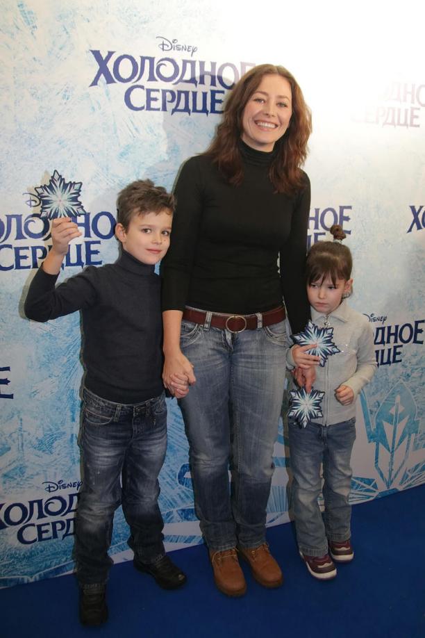 Актриса Екатерина Волкова с детьми на премьере мультфильма «Холодное сердце», Москва, 29 ноября 2013.