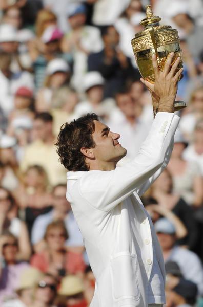 Роже Федерер (Roger Federer) на теннисном турнире Wimbledon Tennis Championships, Лондон, Великобритания, 7 июля 2007. Швейцарец Роже Федерер в пятый раз подряд выиграл Уимблдонский теннисный турнир, повторив рекорд шведа Бьорна Борга. В финальном матче спортсмен одержал пять раз победу над испанцем Рафаэлем Надалем. Матч получился очень напряженным. Никто из соперников не хотел уступать, однако крепче нервы оказались у Федерера, который добился победы. Счет игр – 7:6, 4:6, 7:6, 2:6, 6:2. Бьорн Борг, который побеждал на кортах Уимблдона с 1976 по 1980 год, присутствовал на финальном матче и стал свидетелем повторения своего рекорда. Седых Алиса