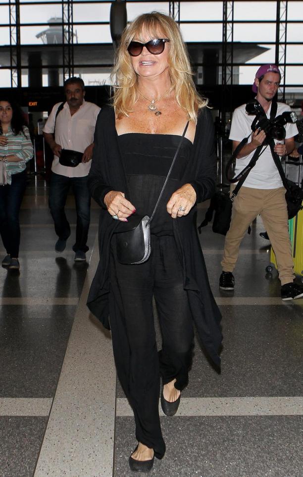 Папарацци подловили знаменитую актрису, когда она собралась улететь из Лос-Анджелеса. На Голди был полупрозрачный черный комбинезон, который она тут же принялась поправлять, чтоб он не сползал с груди.