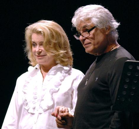 Французская 65-летняя актриса Катрин Денёв (Catherine Deneuve) и итальянский актер Микеле Плачидо (Michele Placido) приняли участие в театральных чтениях на французском и итальянском языке во время фестиваля в городе Марина Ди Пьетрасанта, Тоскана, Италия, 5 августа 2009.