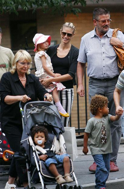 Модель Хайди Клум (Heidi Klum), ее родители и трое ее детей на прогулке в районе «Вест-Виллидж», Нью-Йорк, 5 июля 2008. На фото — Хайди Клум, ее родители — отец Гюнтер Клум (Gunther Klum) и мать Эрна Клум (Erna Klum), а также ее дети: дочь Хелен «Ленни» Клум (Helene "Leni" Klum), старший сын Генри Гюнтер Адемола Дашту Сэмюэль (Henry Gunther Ademola Dashtu Samuel) и младший сын Йохан Райли Фёдор Тайво Сэмюэль (Johan Riley Fyodor Taiwo Samuel).