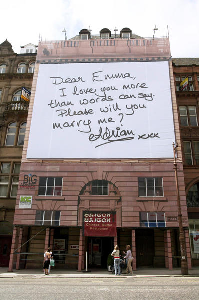 На улице "Saint Andrew`s Street" на одном из домов вывешен огромный плакат с признанием в любви и предложением выйти замуж, Шотландия, Великобритания, 27 мая 2006. Текст на плакате: "Дорогая Эмма, я люблю тебя сильнее, чем можно выразить словами. Пожалуйста, выходи за меня замуж. Эдриан.".