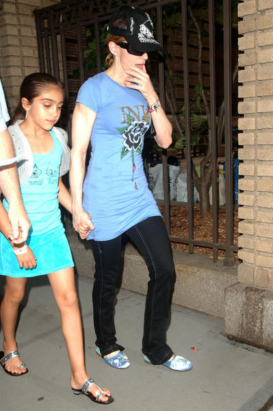 Мадонна (Madonna) с дочерью Лурдес (Lourdes) выходит из дома, Нью-Йорк, США, 27 июня 2006. По словам очевидцев, поп-звезда Мадонна, 47 лет, очень смеялась, узнав, что певица Мерайя Кэрри, 35 лет, отменила несколько концертов из-за непроданных билетов. Поп-звезда не любит Мерайю за то, что однажды она сказала, что выросла на песнях Мадонны. Таким образом Кэрри намекнула Мадонне на ее возраст.