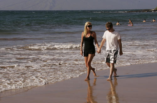 Никки Хилтон (Nicky Hilton) и ее бойфренд купаются в океане на Рождество, Гавайи, США, 24 декабря 2005. Наследница миллиардов гостиничной империи Хилтон и сестра самой отвязной героини светской хроники Никки Хилтон в отличие от сестры предпочитает не только вечеринки. Она уже давно разрабатывает эскизы для дамских сумочек марки Samantha Thavasa. Ее работы пользуются большим спросом среди знаменитостей. Самым большим поклонником сумок от Никки является ее родная сестра Пэйрис, однако, частенько с ними можно увидеть и Бритни Спирс, и Тару Райд и Рию Дурхам.