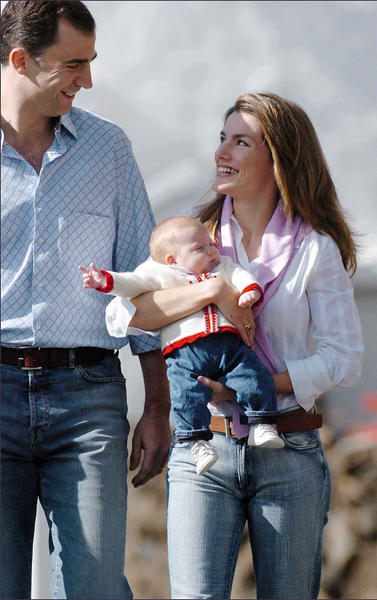 Кронпринц Испании Фелипе с женой и дочерью на Канарских островах. Испанский кронпринц Фелипе (Crown Prince Felipe of Spain) и его жена принцесса Летиция (Princess Letizia) с дочерью принцессой Леонор (Princess Leonor) позировали фотографам на острове Ланзароте, где они проводят рождественские праздники, Канарские острова, Испания, 27 декабря 2005. Маленькая Леонор, первый ребенок в семье принца и принцессы Астурийских может унаследовать испанский престол и стать правящей королевой Испании. Бывшая диктор испанского телевидения Летиция Ортис, которой 32 года, и 37-летний кронпринц Испании Фелипе поженились в прошлом году 22 мая. Согласно действующей конституции Испании, преимущественные права на трон имеют наследники мужского пола. Поэтому, если позднее у Фелипе и Летиции будет сын, он станет наследником после своего отца. В то же время правящая социал-демократическая партия Испании планирует изменить Конституцию, уравняв в правах наследования детей в королевской семье.