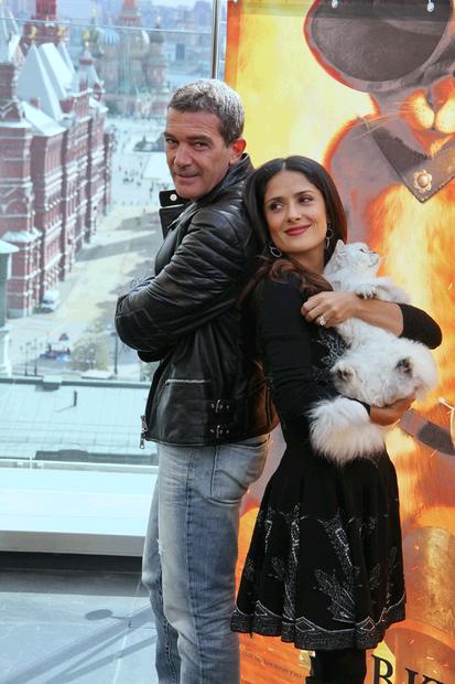 Пресс-конференция мультфильма «Кот в сапогах», отель «Ритц Карлтон», Москва, 26 сентября 2011. На фото: актеры Антонио Бандерас и Сальма Хайек.