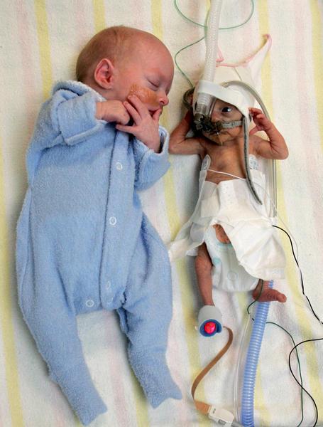 В Сиднее родились двое мальчишек-близнецов, с разницей в одну минуту. Один из них весит 1,5 килограмма, а второй - всего 530 грамм, Австралия, 1 мая 2007.