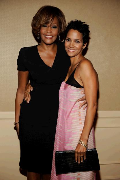 Уитни Хьюстон (Whitney Houston) и Холли Берри (Halle Berry) на вечеринке, приуроченной к выходу альбома I Look To You, Беверли-Хиллз, США, 23 июля 2009.