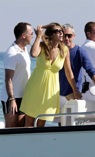 Актер Хью Грант (Hugh Grant), его подруга Джемима Хан (Jemima Khan), актриса Элизабет Херли (Liz Hurley), ее муж Арун Наяр (Arun Nayar) и продюсер Дэвид Ферниш (David Furnish) плывут на катере после посещения ресторана в пляжном клубе Club 55, Сент-Тропе, Франция, 26 августа 2008.