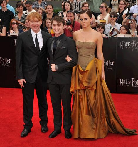 Актеры Руперт Гринт (Rupert Grint), Дэниел Редклифф (Daniel Radcliffe) и Эмма Уотсон (Emma Watson) на Нью-Йоркской премьере фильма «Гарри Поттер и дары смерти. Часть 2» в кинотеатре Avery Fisher Hall в «Линкольн-центре», Нью-Йорк, США, 11 июля 2011.