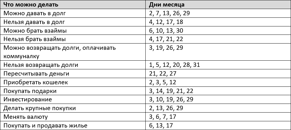 Чтобы воспользоваться энергией Луны с максимальной пользой, нужно определить, какие дни окажутся наиболее подходящими для совершения покупок, банковских транзакций, обмена валют и других действий. Эти даты перечислены в таблице.