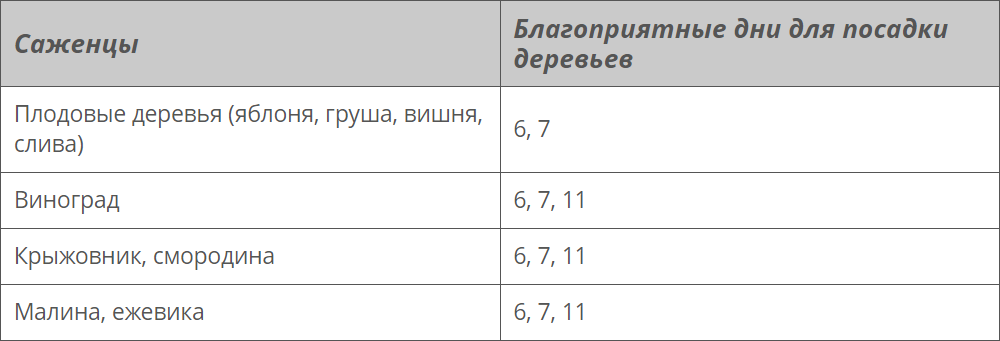 Укоренение саженцев деревьев следует планировать на первые дни месяца. Таблица показывает, какие дни окажутся для этого самыми подходящими.