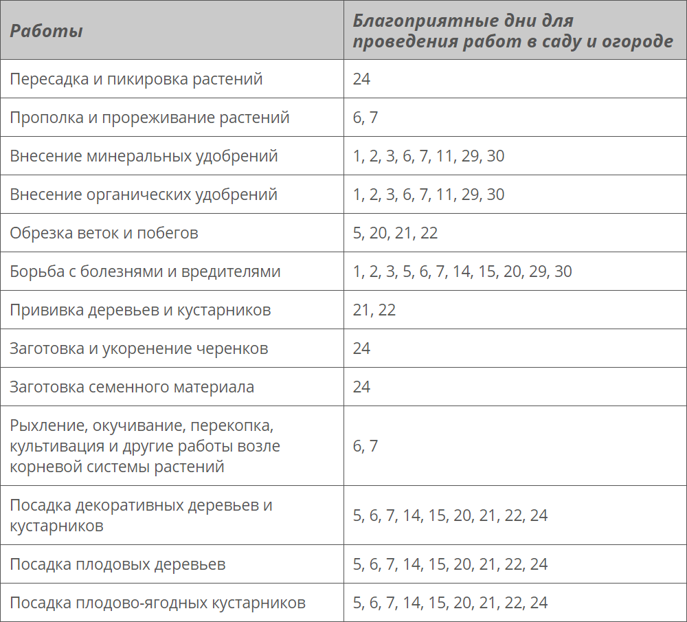 Помимо посадочных работ, следует уделить внимание и другим действиям в саду и огороде. Ниже показано, какие дни окажутся наиболее удачными для ухода за растениями.