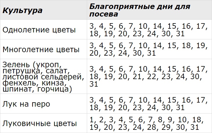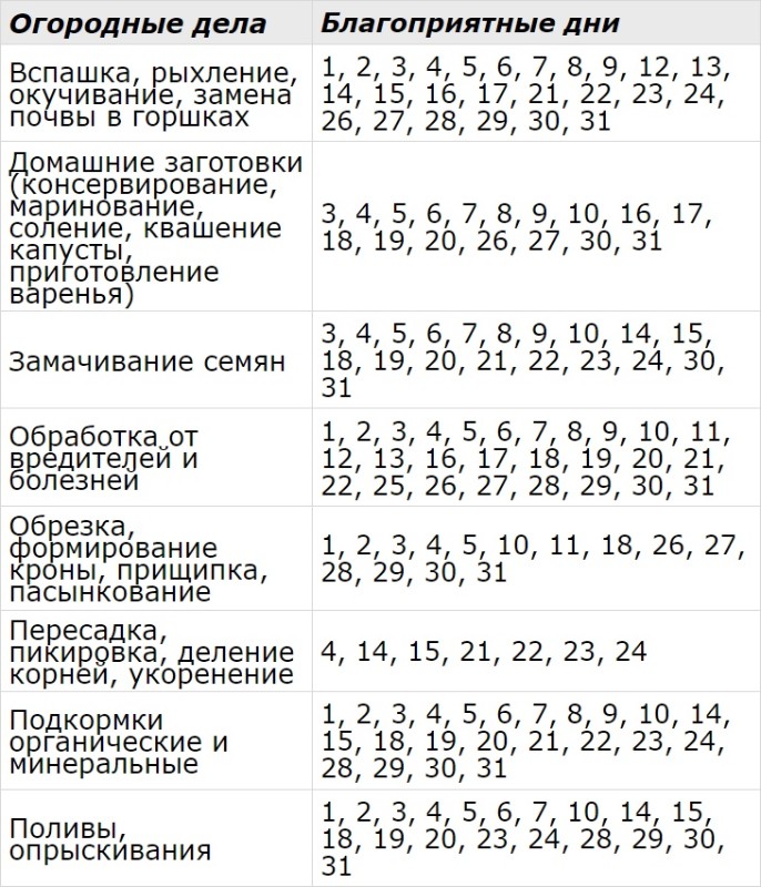 Однако энергетику Луны следует учитывать на только при посадке, но и для планирования других задач, связанных с растениями напрямую и даже косвенно. В таблице ниже указаны дни, которые считаются самыми удачными для проведения конкретных действий.