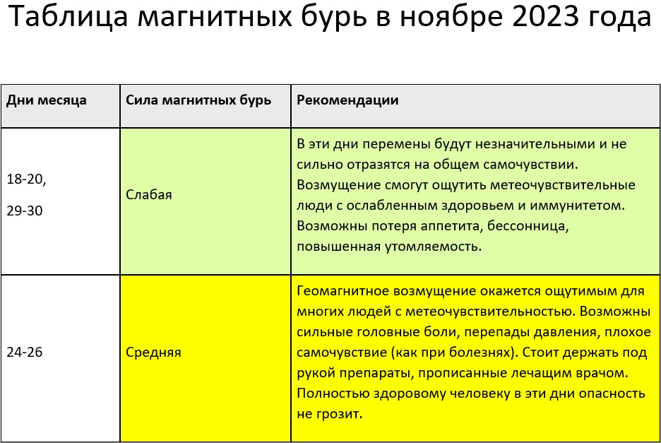 В ноябре 2023 года ожидаются магнитные бури слабой и средней мощности и непродолжительного влияния. Однако несмотря на относительно благоприятный месяц, рекомендуется не терять бдительность и внимательно следить за состоянием своего здоровья. Помните о правилах профилактики и выполняйте рекомендации экспертов.