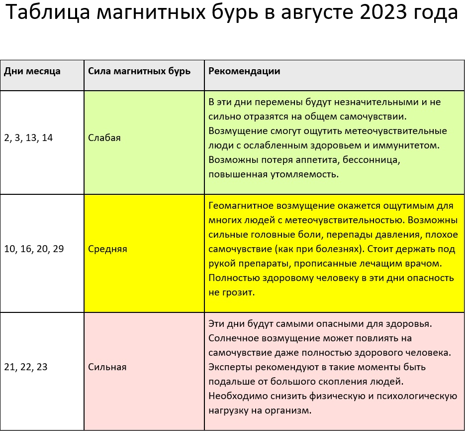 Для своевременной подготовки необходимо знать, в какие дни будут магнитные бури в августе 2023 года и к чему стоит готовиться. Таблица показывает даты и силу предполагаемого возмущения.