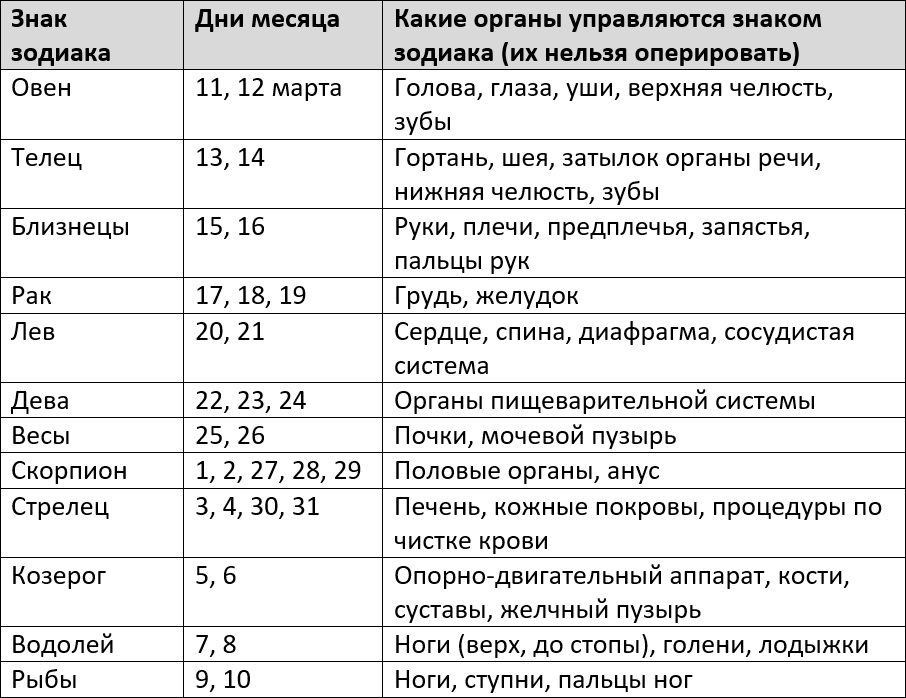 При планировании сложных процедур очень важно учитывать даты, когда нельзя оперировать отдельные органы. Считается, что каждый знак зодиака управляет определенными системами в организме. Когда Луна находится в одном из созвездий, то противопоказано оперировать органы, находящиеся под его влиянием.