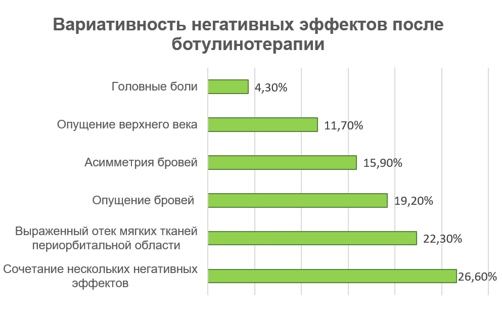 Согласно исследованию "Профилактика нежелательных явлений после ботулинотерапии: оценка эстетических рисков, тактика ведения пациентов с эстетическими ограничениями", опубликованному Издательским домом "Косметика и медицина", самым распространенным негативным эффектом является выраженный отек мягких тканей периорбитальной области. Среди более чем сотни пациентов, медицинские карточки которых изучались в ходе исследования, этот дефект встречался более чем в 22% случаев.