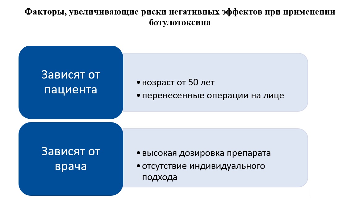 Существуют четыре фактора риска, которые существенно повышают вероятность возникновения негативных эффектов при применении ботулотоксина.