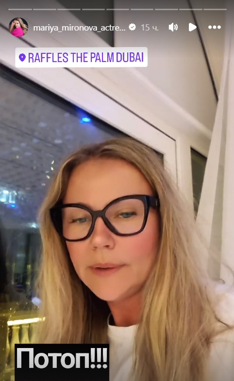 Известная российская актриса Мария Миронова отправилась отдохнуть в жаркий Дубай, но вместо моря и солнца знаменитость оказалась в эпицентре шторма. Крупнейший город в ОАЭ столкнулся с небывалыми ливнями, которые затапливают улицы и первые этажи зданий, порывистый ветер уносит уличную мебель и вырывает деревья. Власти объявили в стране оранжевый уровень опасности.