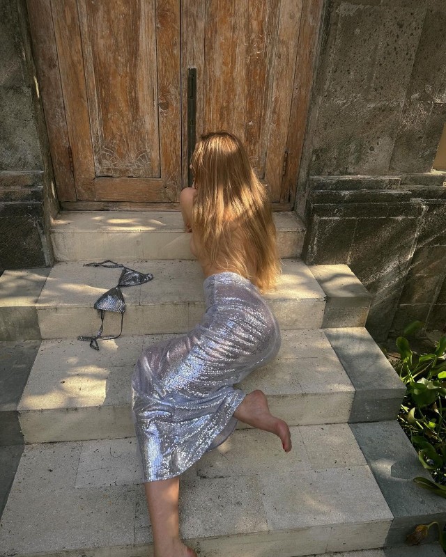 В этот раз 41-летняя Водонаева устроила весьма необычную фотосессию. Она собрала образ в цвете металлик, который состоял из длинной юбки-карандаша, крошечного бра и босоножек в одном оттенке. Правда, обувь и верхнюю часть одежды Алена сняла и бросила на ступеньки. На лестницу девушка рухнула и сама.