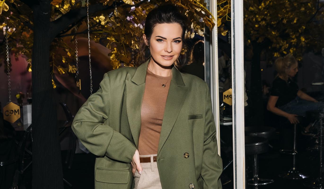 Звезда сериалов Анна Пескова для визита на выставку предпочла строгий и сдержанный стиль, представ в оливковом пиджаке и светлых брюках.