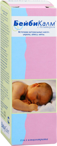 Состав: раствор для младенцев для приема внутрь содержит: 15 мл смеси растительных масел, которая разводится водой перед употреблением до отметки на этикеточной надписи. Бейби Калм представляет собой концентрат смеси растительных масел (укропного, анисового и мятного), во флаконах по 50 мл с дозатором.